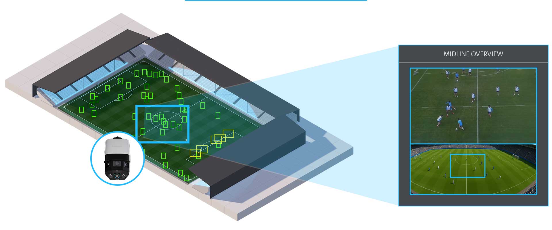 Panomera® Grand View uniquely combines the video streams from the image sensors into a continuous overall view. The individual streams are geometrically aligned and corrected. This gives the user a panoramic view of the action, enabling dynamic and multiple zooming into high-resolution detail views while keeping the overview.
