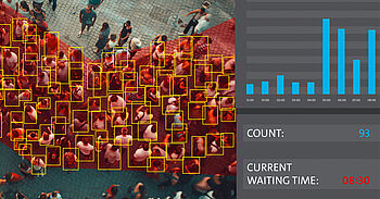 Our systems are open and modular. Thanks to standardised interfaces, AI solutions from other manufacturers can be seamlessly integrated — both individually and with a view to the future. We are already working with strong technology partners: Deep Impact provides powerful face recognition for analysing individual movements in the stadium and for automated employee recognition at access points, for example. ikara offers visitor management solutions such as queue management, automated access control, heat mapping and customer experience, all of which are centrally controlled via a web-based dashboard. In combination with LiDAR technology from Saimos, we can carry out precise real-time analyses of people and vehicle movements, including counting, occupancy, heat mapping and statistics.