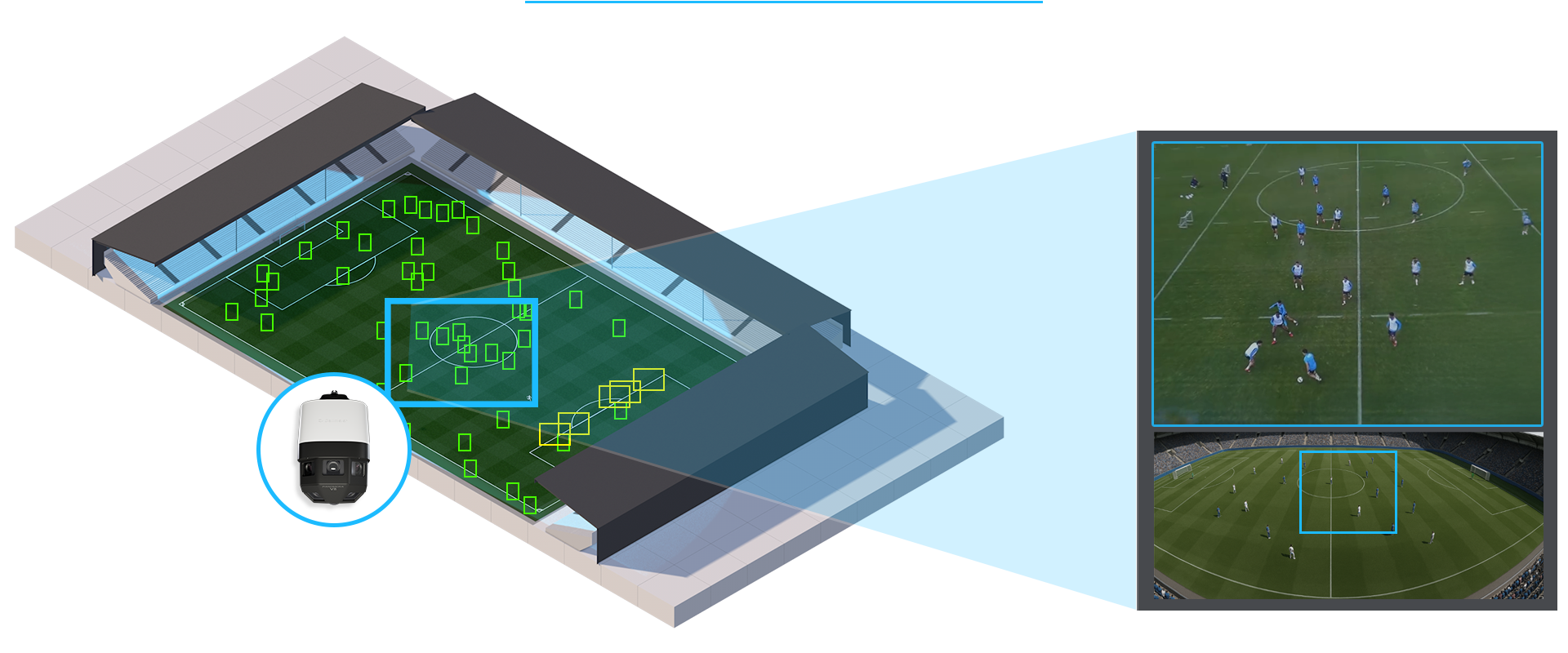 Panomera® Grand View uniquely combines the video streams from the image sensors into a continuous overall view. The individual streams are geometrically aligned and corrected. This gives the user a panoramic view of the action, enabling dynamic and multiple zooming into high-resolution detail views while keeping the overview.